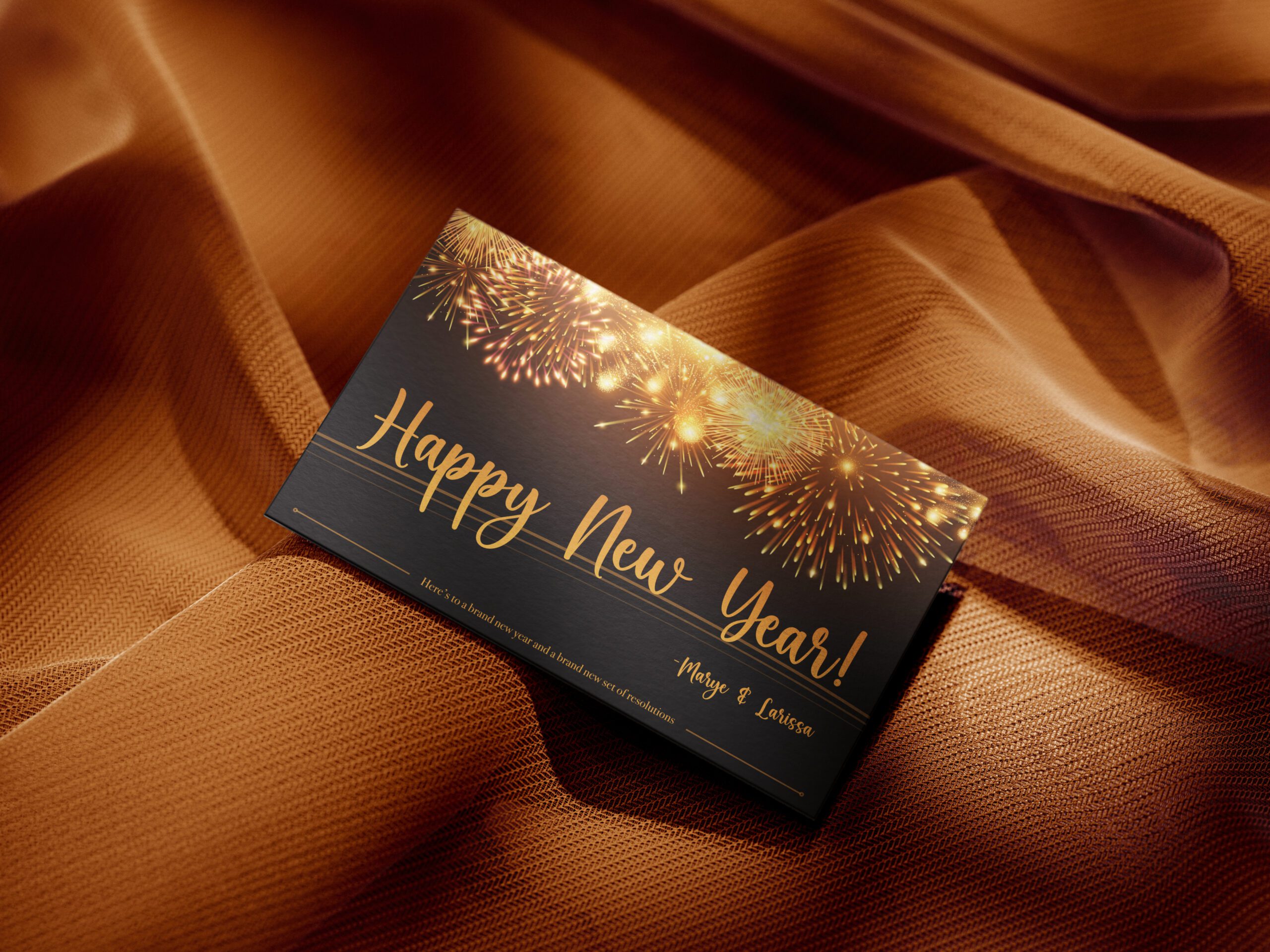 Voor de jaarwisseling ontwierp ik een persoonlijk kaartje om te delen met familie en vrienden, met als doel hen een goed nieuwjaar te wensen. Ik koos voor een kleurenpalet van goud en donkerbruin om een feestelijke en warme uitstraling te creëren, waarbij het ontwerp mooi naar voren komt. Daarnaast maakte ik gebruik van een sierlijk lettertype dat past bij de feestelijke sfeer.